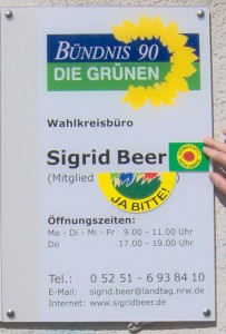 Mit der Auflösung des Landtages verlieren alle MdL ihren Abgeordnetenstatus. Insbesondere dürfen sie den Titel MdL nicht mehr führen. Sigrid Beer hat sich auf die Situation eingestellt. Auf den Wahlkreisbüroschildern ist das „MdL“ mit einem „Atomkraft nein danke“ und „Nationalpark ja bitte“ überklebt.