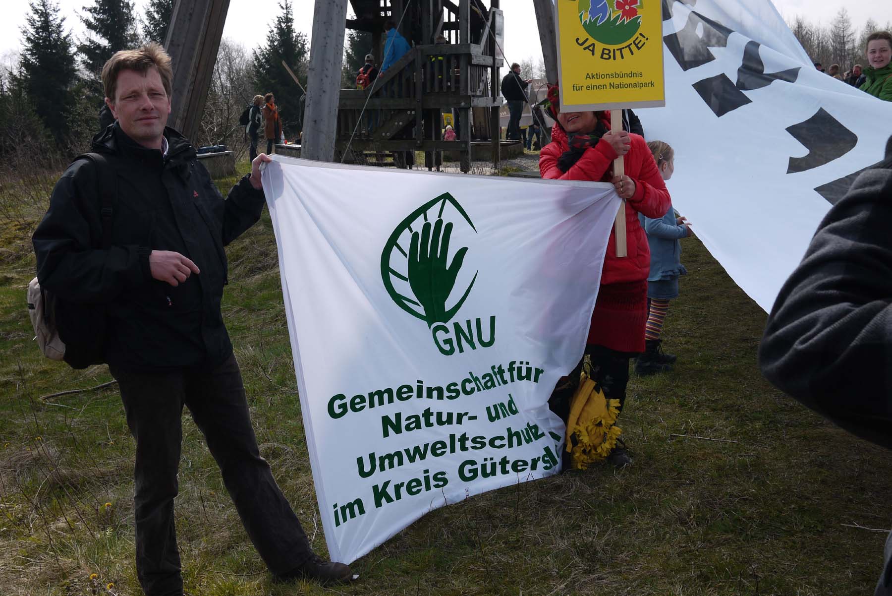Johannes Remmel steht am Fuße des Eggeturms im JETZT. Und plötzlich im Zentrum der Aufmerksamkeit. Über ihm das weiße Band mit NATIONALPARK. Viele gelbe Schilder mit Nationalpark – Ja Bitte-Logo. Jetzt sammeln sich auch die Gegner um den Minister. Kräfteverhältnis 250 Befürworter zu 150 Kritikern.