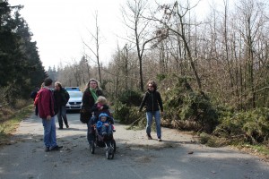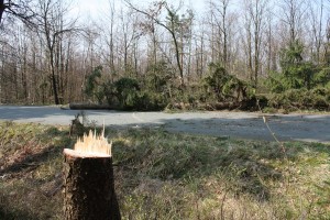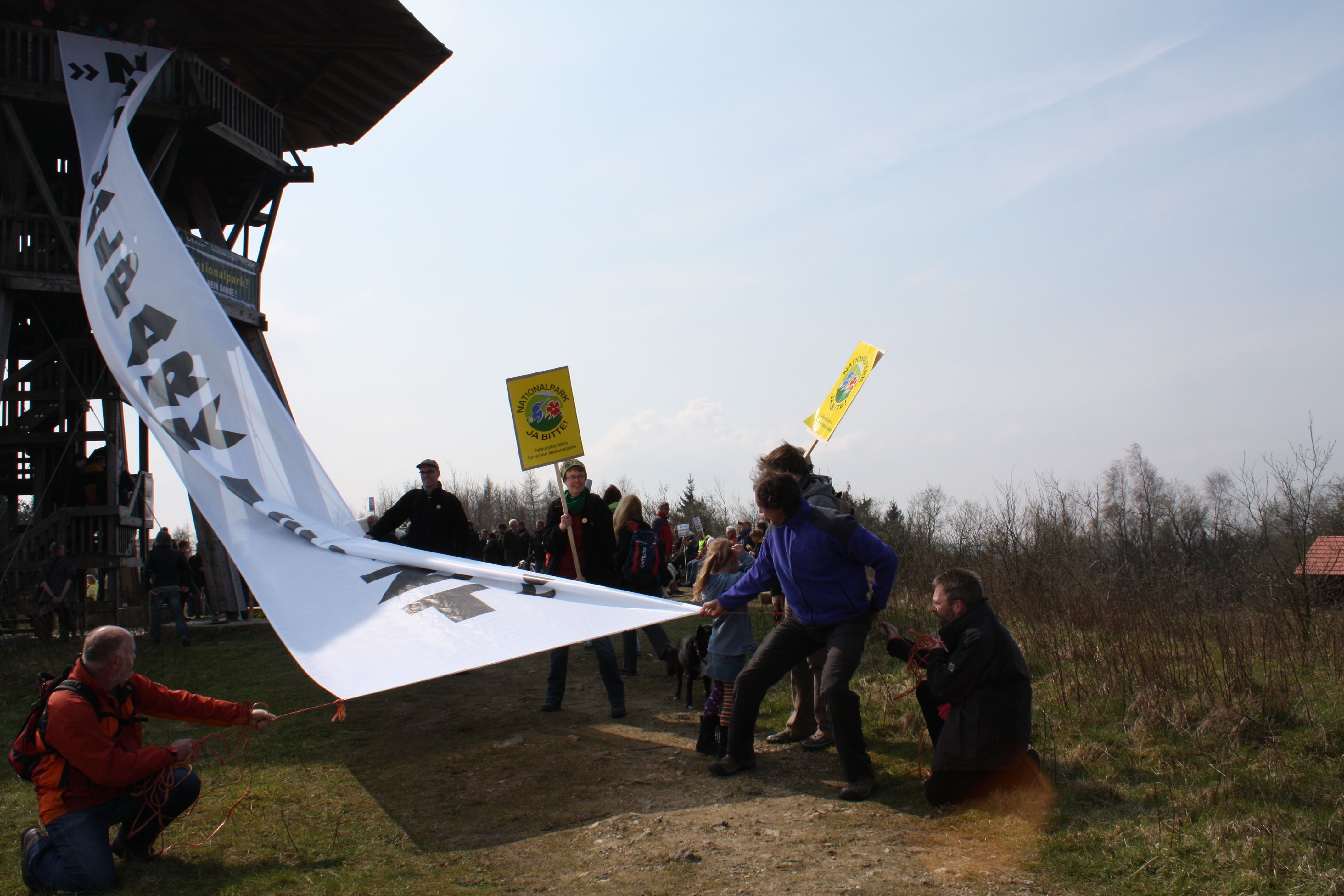 Vier heute nacht mutwillig gefällte Fichten konnte unsere Wandergruppe von mehr als hundert Leuten nicht aufhalten. Selbst den Bollerwagen der Bad Lippspringer Grünen nicht. Sinnlose Aktion der radikalen Nationalpark-Bekämpfer. Wir sind am Eggeturm angelangt. Ganz schön windig hier oben auf der Turmplattform. Gerangel mit den jungbäuerlichen Nationalparkgegnern, als wir das Transparent ausrollen. Es ist zwanzig Meter lang. Die Parole ist klar: NATIONALPARK – JETZT.