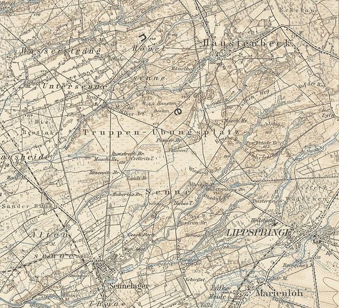 „Die Senne bei Paderborn schuf Gott in seinem Zorn“, fluchten bereits zur Zeit des preußischen Kaisers die Husaren über den allgemeinen Militärübungsplatz am Rande Paderborns. Der Kartenauschnitt des Deutschen Reiches / Blatt 332 zeigt das Militärgelände in der Senne von 1909 und wurde publiziert von der Landesaufnahme Preußen.