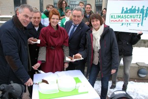 Auf dem Foto zu sehen: Aktion nach der Verabschiedung des Klimaschutzgesetzes: Reiner Priggen, Minister Johannes Remmel, Wibke Brems MdL, Parlamentarischer Staatssekretär Horst Becker und Landesvorsitzende Monika Düker gehen einem „CO2-Kuchen“ an den Kragen. Unsere Aktion haben wir auch in bewegten Bildern festgehalten.