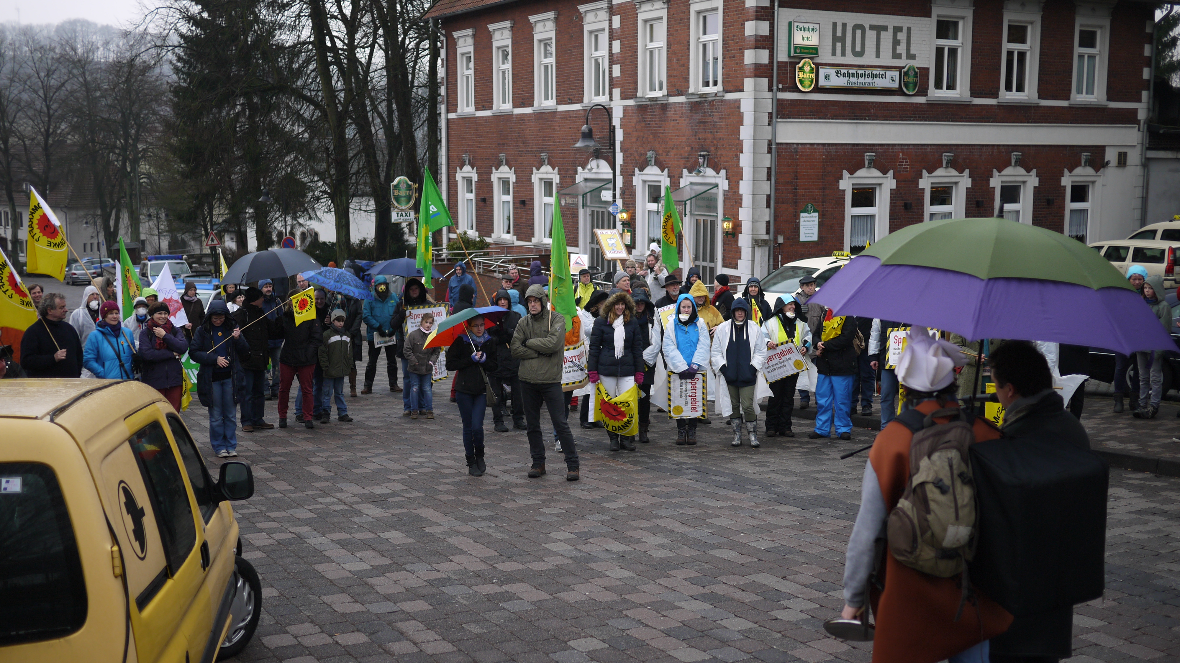 Trotz widriger Umstände, 3 Grad über null blinkte die Anzeige an der Sonnen-Apotheke demonstrierten am Samstag 171 Atomkraftgegner *innen und Klimaschützer *innen in Altenbeken. Das triste Wetter entsprach dem Stand der Energiewende, die sich wie Jürgen Wrona von der Initiative 100 % erneuerbar erklärte, eher zur Rolle rückwärts entwickele. Scharf kritisierte Kerstin Haarmann die kontraproduktive Energiepolitik der schwarz-gelben Bundesregierung.