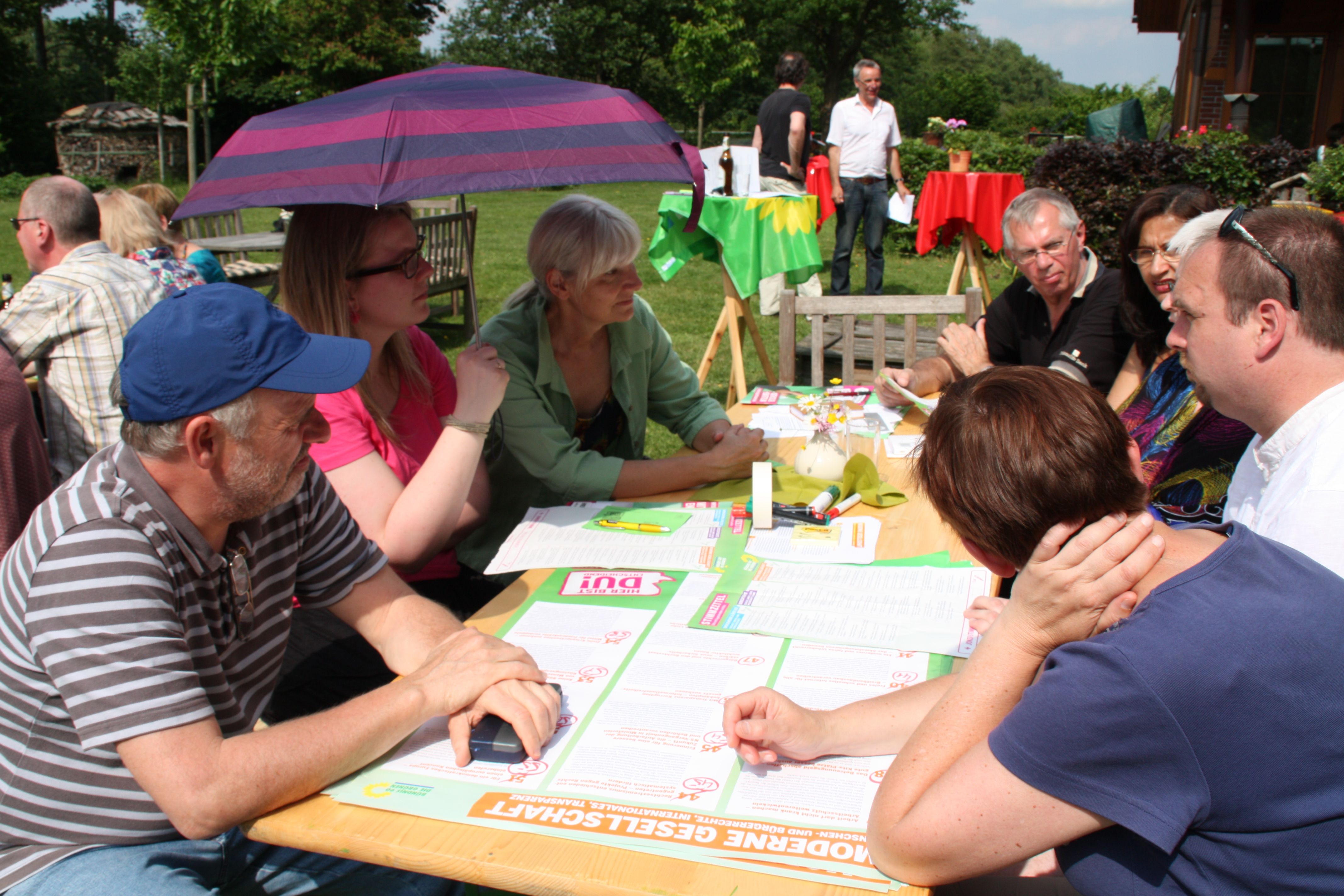 Die Sonne heißt weiter mächtig ein. Fast fünfzig Mitglieder plus Neugierige diskutieren sich warm, werben für ihre Lieblingsschlüsselprojekte. An drei Thementischen – hier ‚Moderne Gesellschaft‘ – treffen Argumente aufeinander. Da muss man schon einen kühlen Kopf bewahren. Aspekte klären sich, die Meinungen unterscheiden sich.