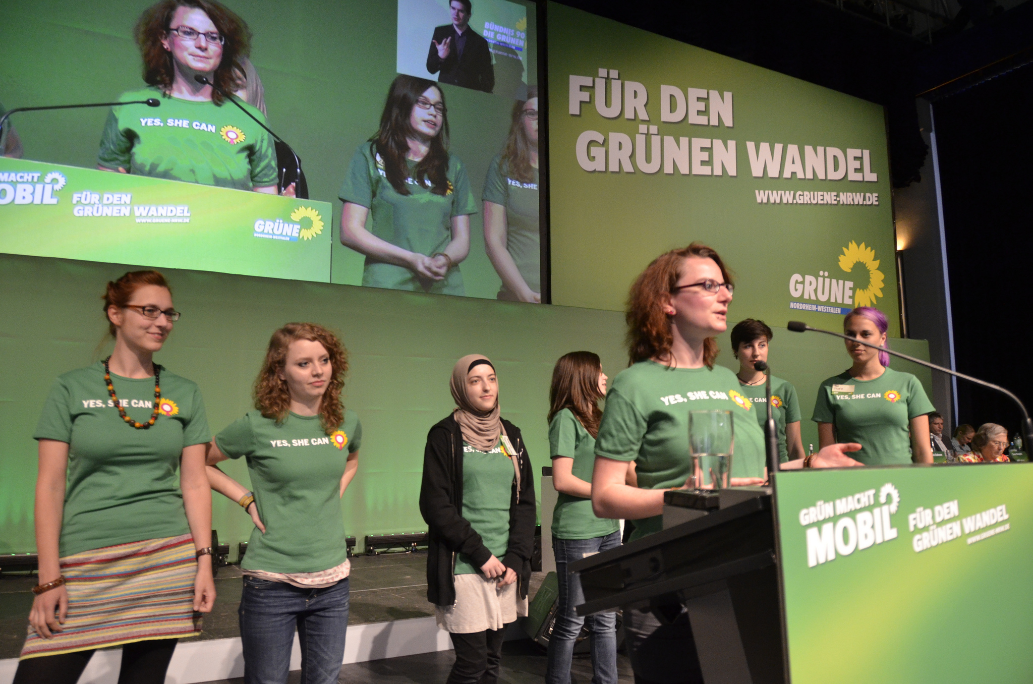 Das erklärt Sigrid Beer, die neben der Paderborner Perspektive auch die Landtagsfraktion und Landesvorstand vertritt. Im Bild die Grüne Jugend mit der Aktion „Yes, she can!“. Im Laufe des Tages veröffentlichen wir ein Interview mit Lisa-Marie Friede, politische Geschäftsführerin der Grünen Jugend NRW und Delegierte aus dem KV Paderborn. (Zweite von links)