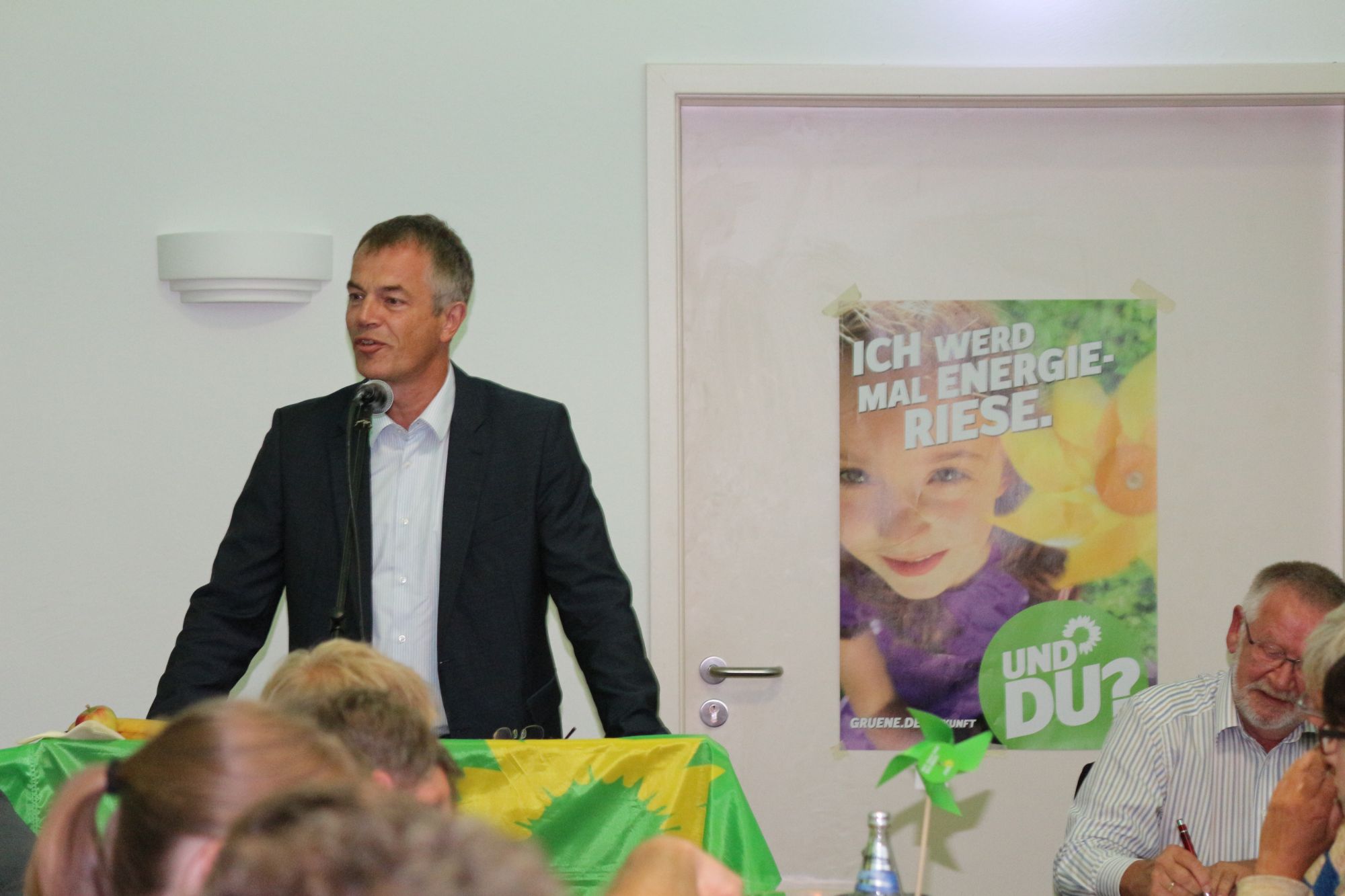 Knapp 150 Leute verfolgen die Debatte im Haxterpark um die Windenergie in Paderborner Land. Johannes Remmel, Minister für Klimaschutz und Umwelt des Landes NRW, sieht Deutschland bei der Energiewende vor einer Weggabelung. Wird die 2011 mit breiten gesellschaftlichen Unterstützung politische Entscheidung für eine umfassende Energiewende in die Tat umgesetzt oder eher abgewürgt? An vielen Stellen agiere die Politik, speziell die der schwarz-gelben Regierung, entgegen der klimapolitischen Rahmensetzungen. Ende September komme der nächste Weltklimareport, der mit zunehmender Wahrscheinlichkeit warnt, dass das 2 %-Ziel verfehlt werde.