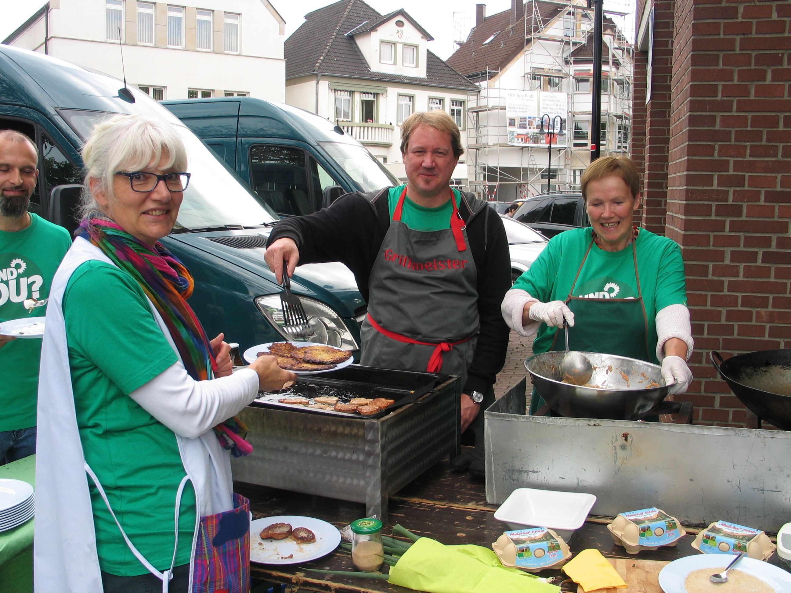 Herzhaft oder süß heißt die Alternative auf dem Sälzer Markt zwischen dem Marktwagen vom Eggehof mit Fleisch und Wurst aus artgerechter Tierhaltung und der Fischbude von Thönes. Die Salzkotten Grünen bruzeln auf ihrer mobilen Küche Gemüseburger und Püfferchen. An einem Freitag, den dreizehnten, ist vegetarisch angesagt. Am grünen Tisch werden die Rezepte ausgetauscht. Der Grüne Stand macht am meisten her, wirkt mit den Puffern, den Heliumballons und Beachflags wie ein großer Magnet.