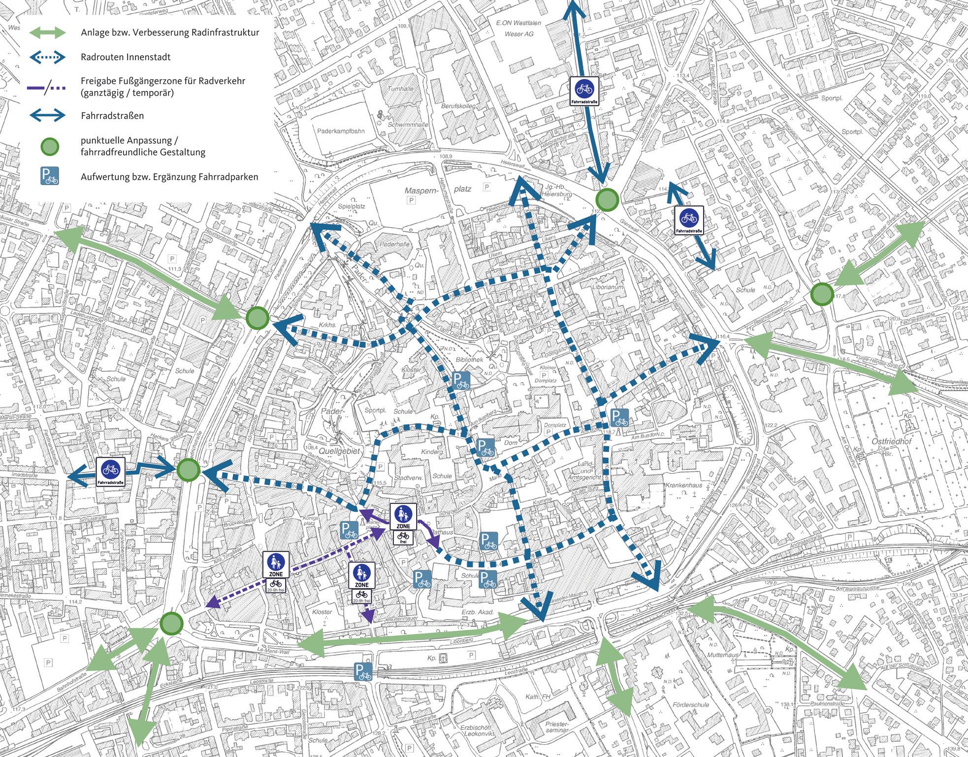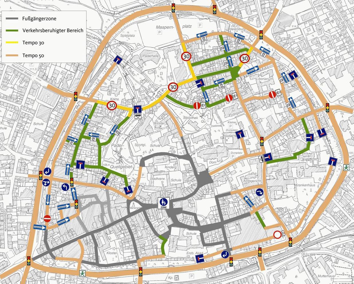 „Zukunft einer Stadt wird durch das Fahrrad definiert“, erklärt ein stadtbekannter Buchhändler und trifft damit den Kern bei der Vorstellung des Verkehrskonzeptes. Im Rathaus erläutert Dr.-Ing. Michael Frehn von der Dortmunder „Planersocietät – Stadtplanung, Verkehrsplanung, Kommunikation“, wie sich in Paderborns Innenstadt die Verkehrsituation verbessern lässt. Die Abbildung aus dem Verkehrsgutachten zeigt die unbefriedigende Situation. Viele grüne Vorschläge, Anträge und Vorstellungen wie Tempo 30, Carsharing, Rosentor, Fahrparkplätze, sind aufgegriffen.