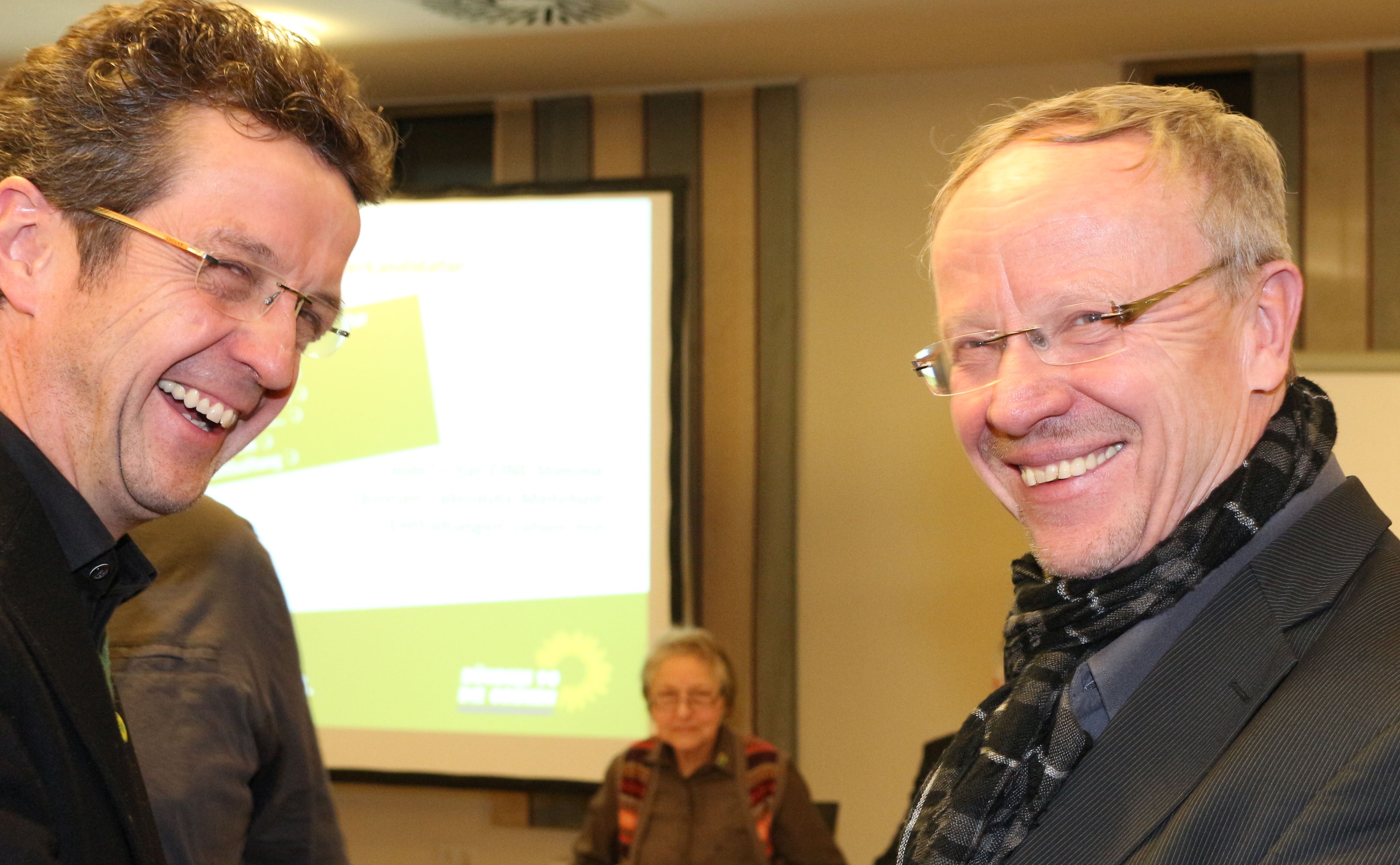 Gratulation von Kandidat zu Kandidat. Die Mitgliederversammlung des grünen Stadtverbandes Paderborn wählte gestern abend einstimmig bei drei Enthaltungen Andreas Krummrey (rechts) zum grün-getragenen Bürgermeisterkandidaten. „Wir Grünen setzen damit ein deutliches Signal für den überfälligen politischen Wechsel in Paderborn. Sachargumente müssen entscheiden, nicht das Parteiinteresse. Kluge Köpfe wählen deshalb Krummrey“, erklären der grüne Stadtvorstand und die Fraktionsspitze. Der grüne Kreisfraktionsvorsitzende und designierte Landratskandidat Harald Grünau (links) schätzt Krummrey aus seiner Arbeit im Kreis.