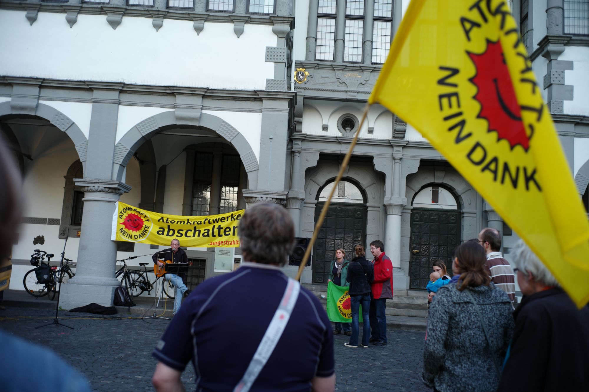 Inzwischen sind mehr als fünfzig Atomkraftgegner dem Aufruf gefolgt, vor dem Paderborner Rathaus an die Opfer von Fukushima und die Folgen der Nuklearkatastrophe zu gedenken. Nach einer Gedenkminute wechseln sich Nachrichten aus Fukushima mit Protestsongs ab. Die Redner*innen zitieren aus internationalen Blättern für Politik: „Drei Jahre nach Fukushima: Vergessen und Verdrängen“.