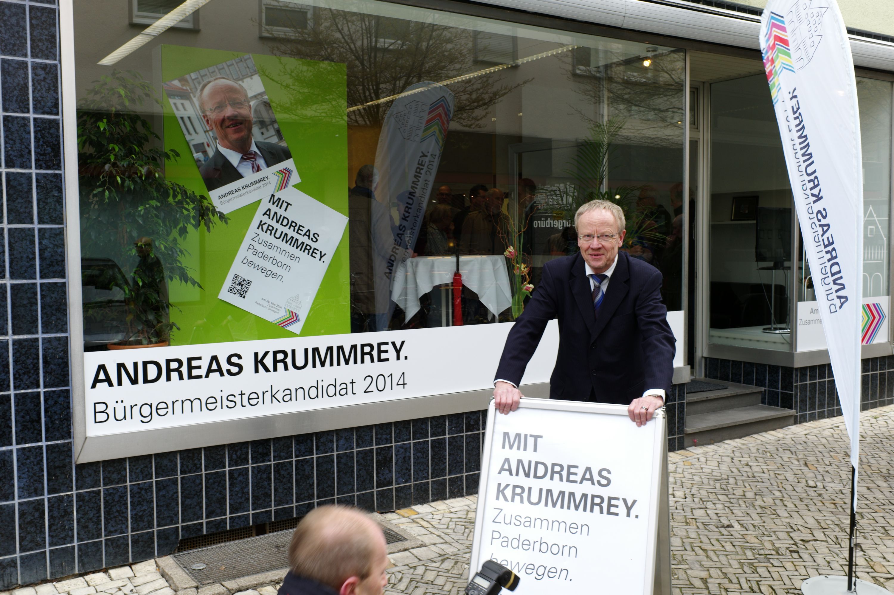 Im Anschluss begrüßte der unabhängige Bürgermeisterkandidat in seinem vollen Ladenlokal viele politische Neugierige und Unterstützer. Die meisten grünen Ratsmitglieder zeigten sich vom neuen Kommunikationstreffpunkt sehr angetan. „Eine sehr transparente Atmosphäre an einem zentralen innenstädtischen Ort, die einlädt, mit Andreas Krummrey über die Paderborner Politik zu diskutieren“, lobt Werner Jülke. Besonders gefallen hat dem grünen Stadtsprecher der Plan des Bürgermeisterkandidatens, sich einen halben Tag auf dem Rathausplatz zu setzen, um die Verkehrsflüsse – Stichwort: Busse in der Innenstadt – zu verfolgen.