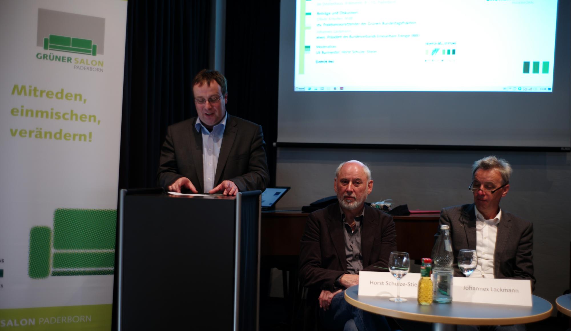 Im ‚Grünen Salon‘, moderiert von Horst Schulze-Stieler und Uli Burmeister, diskutierten zwei ausgewiesene Experten, der grüne Bundestagsabgeordnete Oliver Krischer (links) und der Paderborner Windenergiepionier Johannes Lackmann (rechts), die aktuellen ökonomischen und politischen Probleme der Energiewende mit zahlreichen Interessierten, die trotz des nicht nur für die Sonnen- und Windenergieerzeugung geeigneten Wetters ins ‚Deelenhaus‘ gekommen waren. Die differenzierten Stellungnahmen des Podiums umkreisten einen eigentlich überraschenden Punkt: Obwohl die in den letzten Jahren als Erfolgsgeschichte dargestellte Expansion der Ökostromproduktion inzwischen als ein gesamtgesellschaftliches Projekt erscheint, obwohl auch die große Koalition die Energiewende als Aufgabe übernommen hat, zeigt sich auf der von der Heinrich Böll Stiftung unterstützten Veranstaltung die Sorge, ob die für die Klimarettung notwendigen Veränderungen rechtzeitig und zu tragbaren Bedingungen politisch durchgesetzt werden.