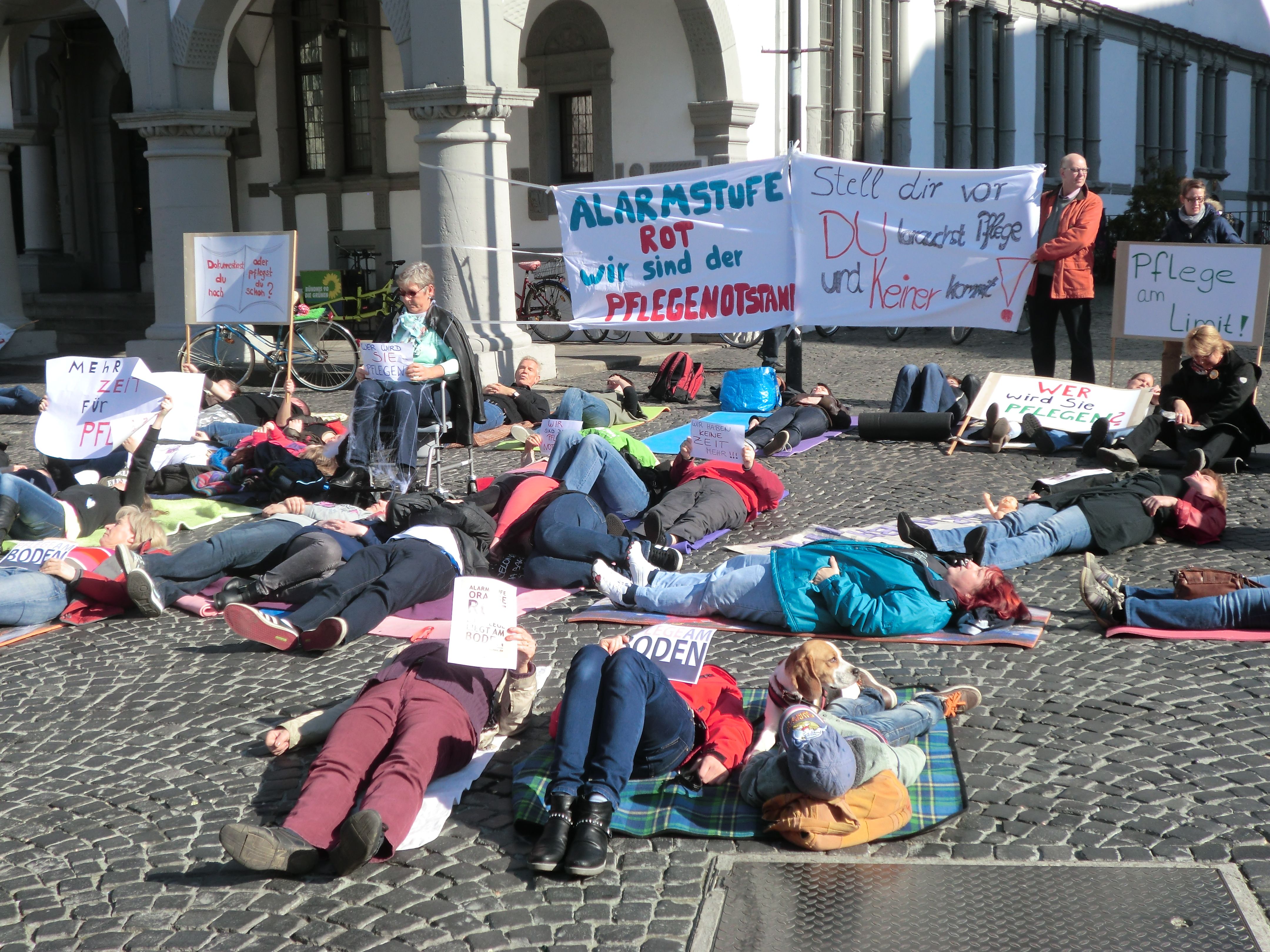 Samstag mittag, 11.55 Uhr legen sich Pflegekräfte sich für 10 Minuten auf das Pflaster vor dem Rathaus. Bis fünf nach zwölf liegt die Pflege am Boden. Mit diesem Smartmob weisen die Teilnehmer, unter ihnen der grüne Stadtsprecher Werner Jülke, auf die immer schlechter werdende Situation in den Pflegeberufen hin. Arbeitskräftemangel, zu niedrige Bezahlung, geringe Wertschätzung der Tätigkeit und hohe Arbeitsverdichtung belasten den Beruf der Pflege.