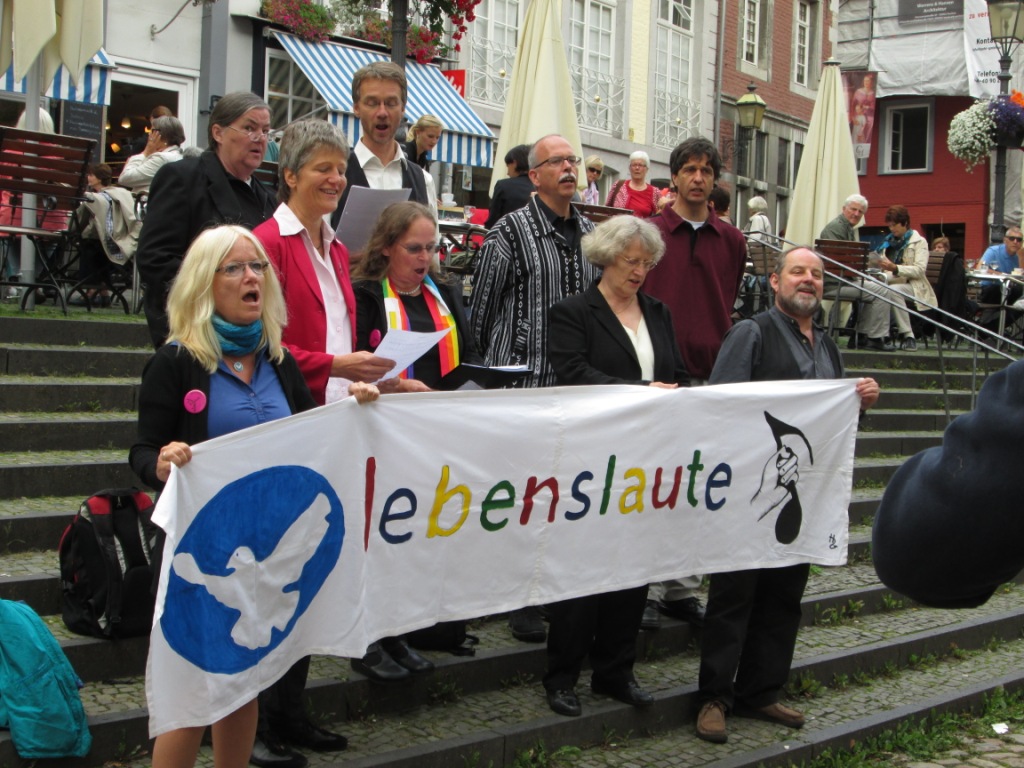 Die Gruppe „Lebenslaute“ besteht aus Musikern, die in den ersten Jahren z.B. in Mutlangen, Gorleben und Wackersdorf mit Sinfoniekonzerten Zufahrten blockierte. Aktuell standen Aktionen vor der Waffenschmiede Heckler und Koch oder vor der Abschiebehaftanstalt in Eisenhüttenstadt auf dem Programm. Hier eine stimmgewaltige Szene am Rande der Preisverleihung in Aachen.