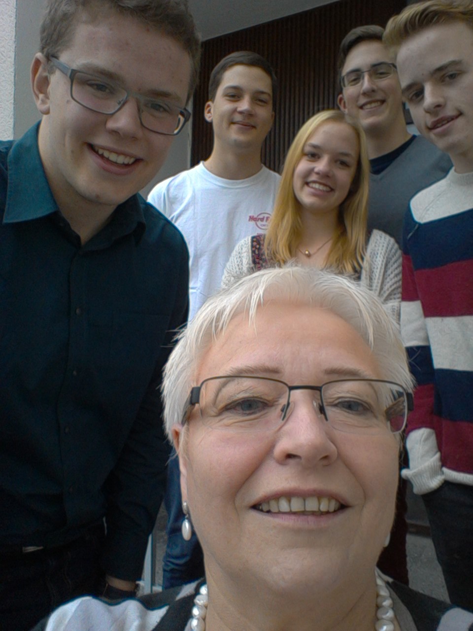 Foto: Ein „Selfie“ mit der Landtagsabgeordneten Sigrid Beer Von links nach rechts: Gregor Christiansmeyer, Simon Schmitt, Jana Winkler, David Gussen, Yannik Sammert. Es fehlt Dominik Asbach.