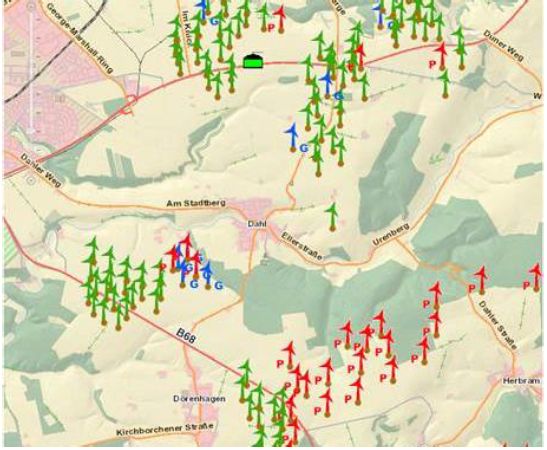 Lässt man diese „Phantom-Windräder“ (die roten sechs Windräder von rechts auf dem Kartenauschnitt, Quelle RIS Paderborn) außen vor, gibt es von Dahl aus gesehen nach Osten und Süd-Osten keine Anlagen, womit sich ein vollkommen anderes Gesamtbild ergibt. Die Grünen fragen sich, warum die Stadt dies in ihrer Vorlage nicht berücksichtigt. Darüber hinaus stelle die Vorlage für den Bauausschuss auch Anlagen, für die ein Rückbau längst beschlossen sei, als normale Bestandsanlagen dar.