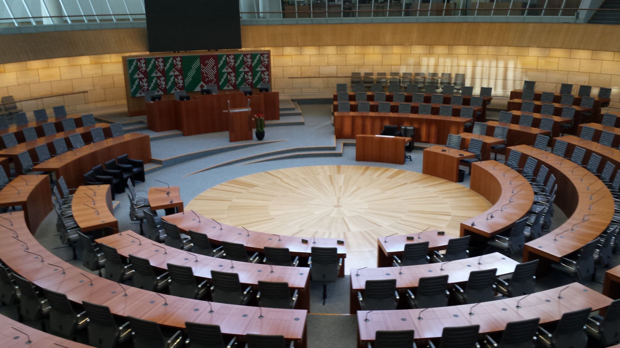 13:04 Uhr: Ebenso wie das Gebäude ist auch der Plenarsaal rund. Unten sitzen die Abgeordneten und oben das Volk. Die Sitzreihenfolge der Parteien ergibt sich aus der jeweiligen Tradition: Zu Zeiten der französischen Revolution haben die Konservativen rechts gesessen und die Fortschrittlichen links. Auf den Tischen stehen Mikrofone. Fotos sind während der Sitzungen wegen der Fernsehkamera nicht erlaubt. Bei unseren Besuchen dürfen wir fotografieren. Unten in der Mitte hängt ein buntes Bild, auf dem sechsmal das Wappen zu sehen ist.
