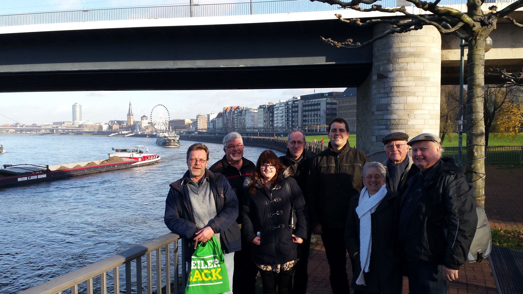 11:50 Uhr: Mit wieder fließendem Verkehr fahren wir an der Landeshauptstadt Düsseldorf, vorbei, behauptet der Busfahrer. Findet aber einen Parkplatz unter einer großen Brücke, direkt am Landtag. Die Sonne strahlt, der Himmel ist blau und die Laune ist immer noch gut und heiter. Es werden die letzten Anweisungen durchgegeben. Dann haben wir noch 45 Minuten Zeit, also beschließen wir zusammen ein Stückchen am Rhein entlang zu schlendern. Auf dem Weg dorthin, sehe ich eine Skaterbahn und einem Fahrradhändler. Am Rhein angekommen machen wir ein Gruppenfoto, unterhalten uns über vergangene Veranstaltungen in Düsseldorf und über den Landtag.