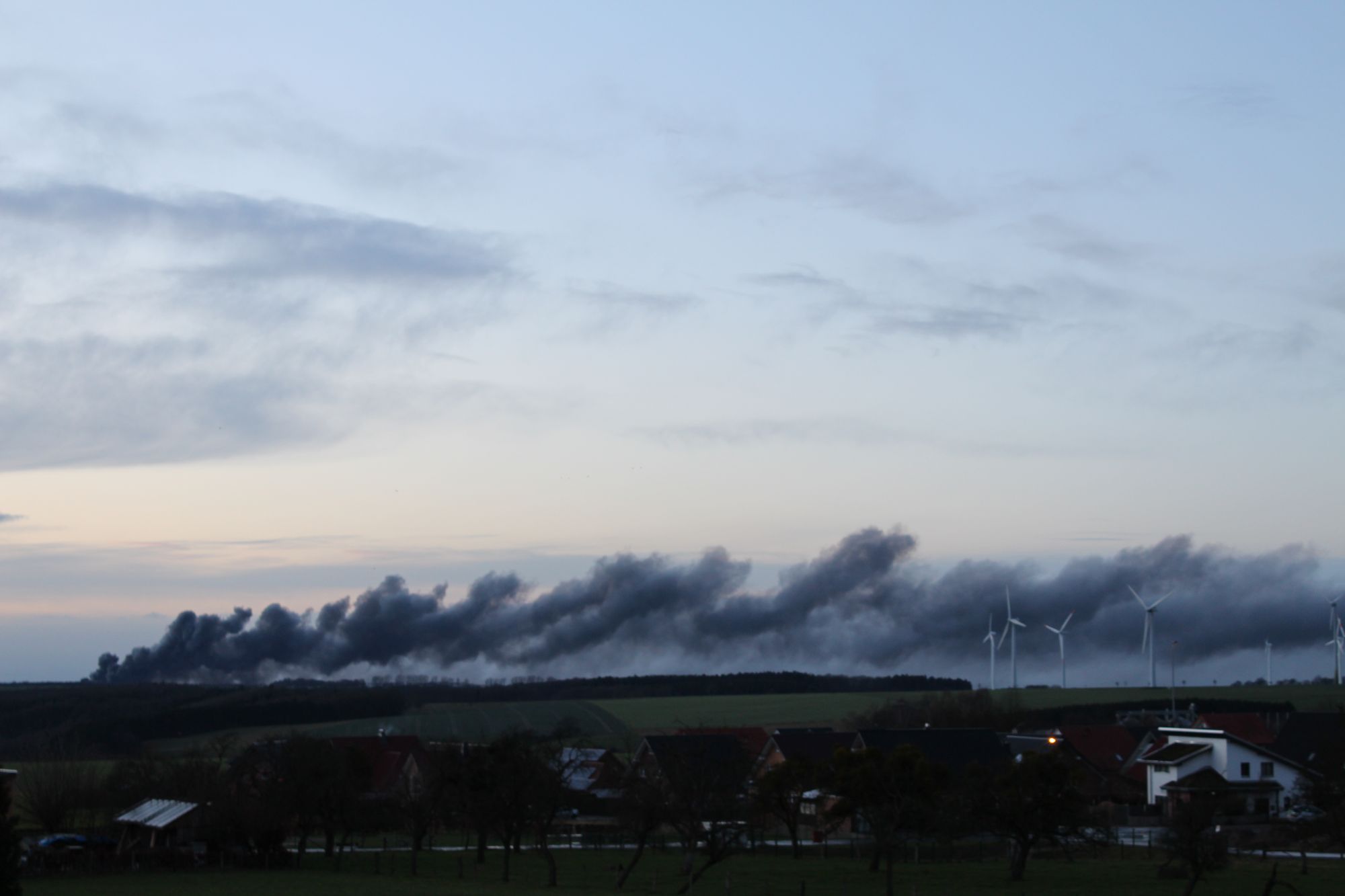 Was auf den ersten Blick, hier aus Richtung Dahl/Dörenhagen, wie eine harmlose Rauchfahne eines Dampfzuges anmutet, steckte voller Giftstoffe und Feinstaubpartikel. Der Großbrand bei Westfleisch verursachte eine stinkende, weit sichtbare Qualmwolke, die vom Wind über die Südstadt getrieben wurde. Die Bürgerinnen und Bürger in der Umgebung, speziell in diesem Stadtteil, wurden gebeten, Türen und Fenster geschlossen zu halten. Die Feuerwehr und das Umwelt-Landesamt nahmen Messungen der Schadstoffkonzentration vor und gaben im Laufe der Löscharbeiten eine Entwarnung.