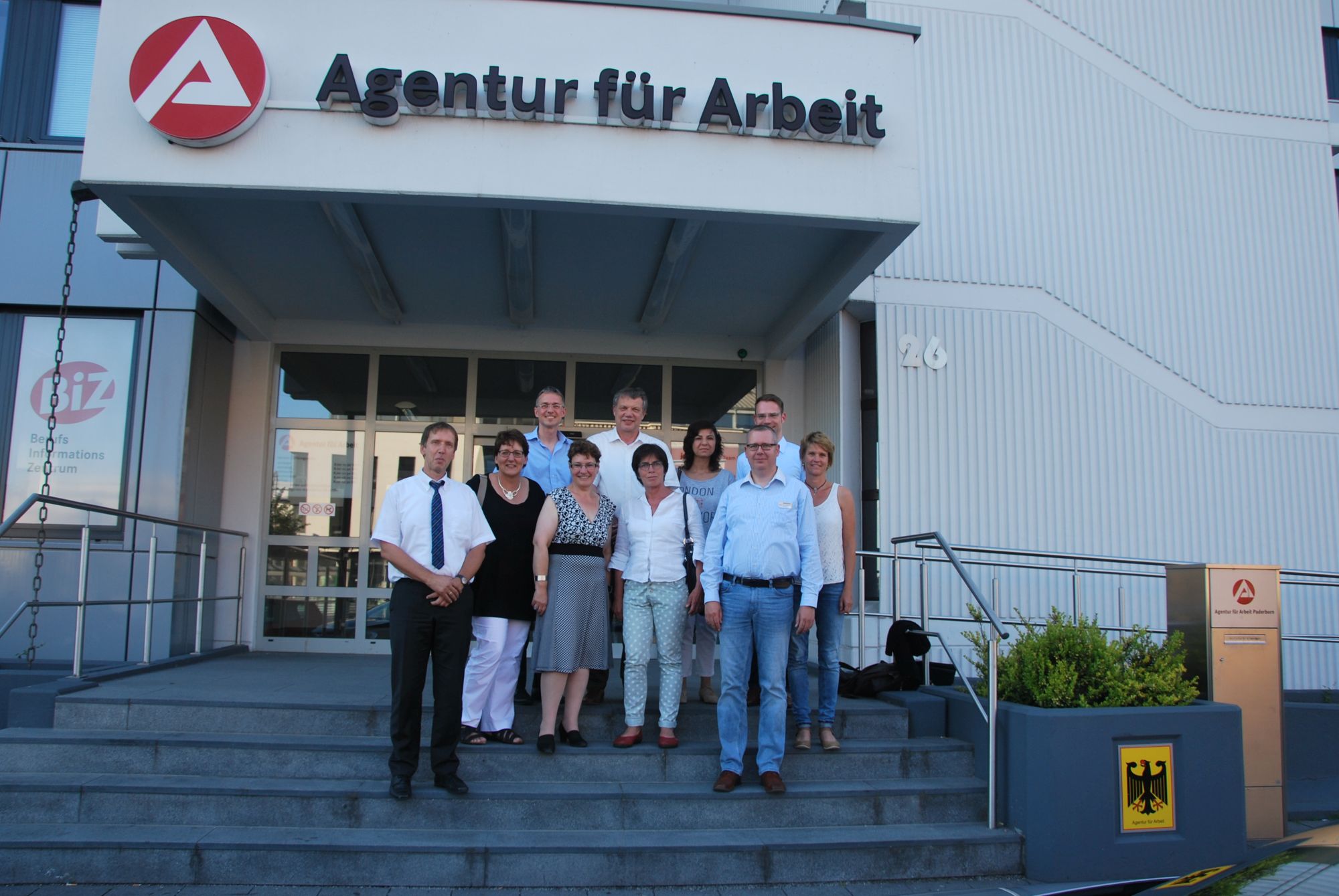 Auf dem Foto: Die grünen Ratsfrauen im Gespräch mit Arbeitsagenturleiter Rüdiger Matisz (1.v.l.), Dr. Oliver Vorndran (Kommunales Integrationszentrum, 3.v.l), Martina Maaßen (Mdl) 4.v.l, Horst-Hermann Müller (Jobcenter 5.v.l.) und Burkhard Voß (Integration Point 2.v.r),
