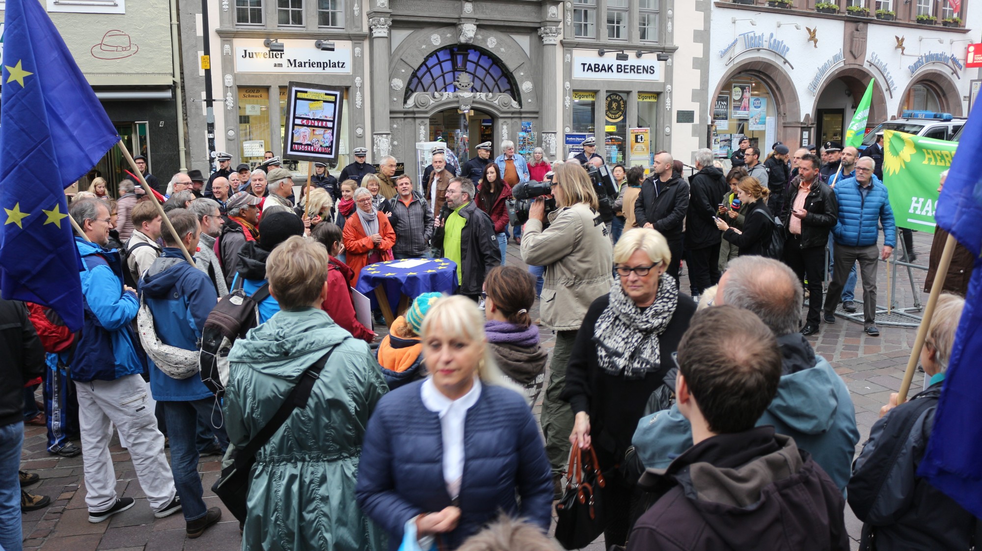 Die Sprecherin der grünen Ratsfraktion Petra Tebbe zur Frage des Paderborner Bündnisses für Demokrtie und Toleranz, Den sozialen Zusammenhalt stärken! Was ist jetzt zu tun?“ Das Foto zeigt die heutigen Demonstration des Bündnisses.