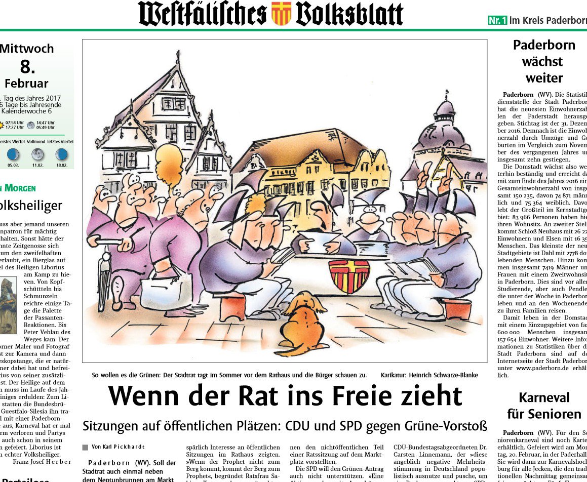 Aber der Reihe nach: Um dem zunehmenden politischen Desinteresse offensiv entgegenwirken, hatten die Grünen beantragt, den Stadtrat ins Freie zu holen. Im Rahmen einer „Woche für kommunalen Demokratie“ sollte die Kommunalpolitik aktiv beworben werden, verschiedene Informationsveranstaltungen sollten ihren Höhepunkt dann in einer doppelt öffentlichen Ratssitzung unter freiem Himmel finden. Vom WV bildhübsch in Szene gesetzt (Ausriss des lokalen Aufmachers am 8. Februar).