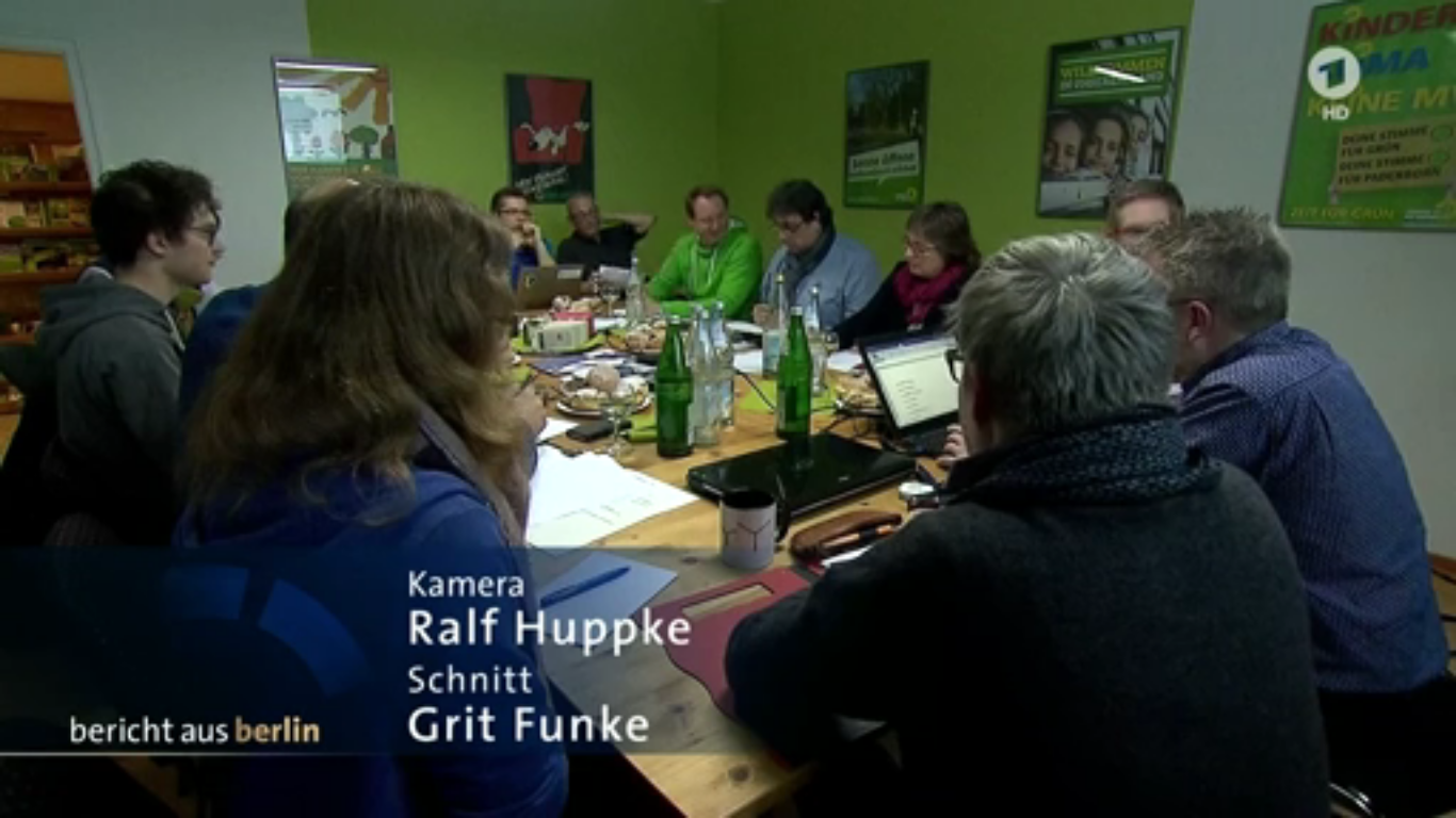An Weiberfastnacht kündigte sich ein ARD-Team aus dem Hauptstadtstudio an. Für den „Bericht aus Berlin“ sollten Eindrücke von der grünen Basis gesammelt werden. Weil das grüne Rheinland Helau & Alaaf skandierte , mussten wir im Wahlteam für die Stimmungsbilder sorgen. Das ARD-Team filmte dafür etwa dreißig Minuten der Wahlkampfplanung, führte dann ein Gruppeninterview, anschließend ein Gespräch mit Kreisgeschäftsführer Johannes Menze. Schade, dass es daraus dann nur 45 Sekunden in den Bericht aus Berlin geschafft haben, der am Sonntag ausgestrahlt wurde, denn natürlich konnte unmöglich das gesamte padergrüne Meinungsspektrum abgebildet werden.