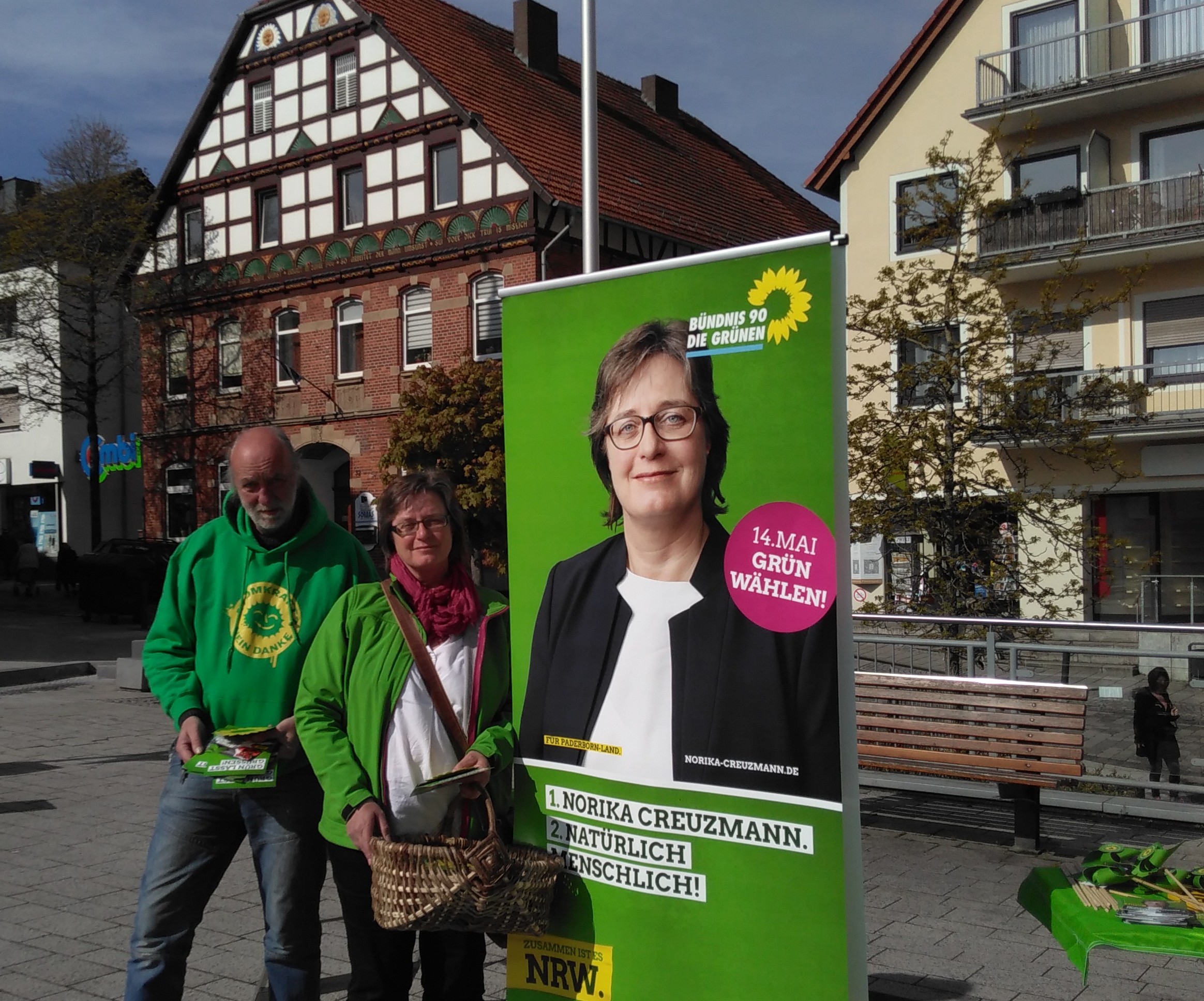 Am Mittwoch hat Norika Creuzmann auf dem Marktplatz grüne Informationen und Einladungen zum Kaffeeklatsch mit den Bürener Grünen verteilt. Hier zusammen mit Andreas Bredelow. Am Samstag stellt sich die Landtagskandidatin von 15 Uhr bis 17 Uhr im Restaurant Sorbas vor. „Ich freue mich auf viele neugierige Fragen“, erklärt Creuzmann. Interessierte sind herzlich willkommen, im roten Backsteingebäude im Fotohintergrund, Burgstr. 32, auf Kaffee, Tee und Kuchen vorbeizukommen.