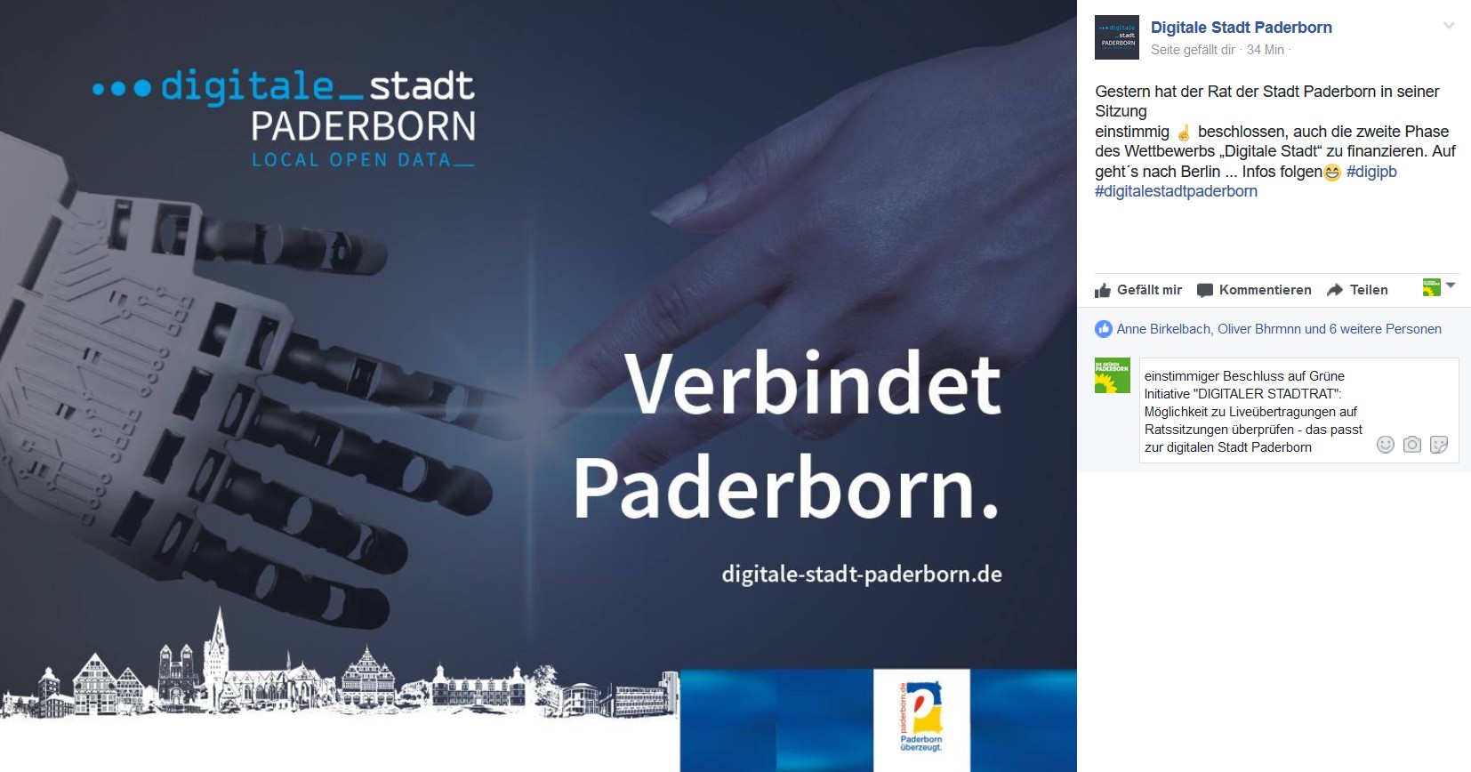 Paderborn ist führender IT Standort und hat das Finale im Wettbewerb Digitale Stadt erreicht- der „Digitale Stadtrat“ würde uns auch in diesem Zusammenhang gut zu Gesichte stehen. Hier ein Screenshot der Kampagnenseite auf Facebook.