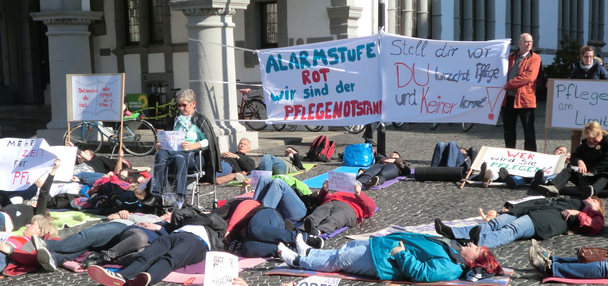 Pflegekräfte kämpfen Tag für Tag für das Wohl der ihnen anvertrauten Menschen. So leiden sie unter schlechten Arbeitsbedingungen und Unterbesetzung. Sie haben ständig die Zeit im Nacken und immer wieder das Gefühl, den Patienten und Bewohner*innen nicht ausreichend versorgt zu haben. Die Pflegenden arbeiten unter ständiger Überbelastung und erhalten dafür zu wenig Geld. Im Bild die Demo „Pflege liegt am Boden“ vor dem Paderborner Rathaus.