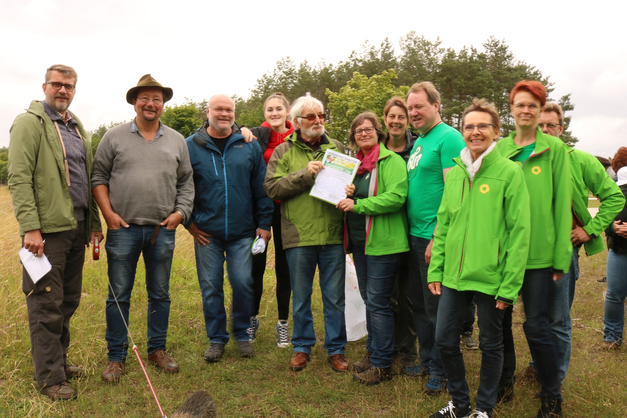 400 Unterschriften zum Schutz der Sennelandschaft überreichte Norika Creuzmann an den Umweltaktivisten Fritz Buhr und OWL-Bezirksvorsitzenden Karsten Otte (auf dem Foto mit Hut). Darunter die Signaturen des grünen Bundesvorsitzenden Robert Habeck, des Europa-Abgeordneten Sven Giegold, der NRW-Bundestagsabgeordneten Britta Haßelmann und Oliver Krischer. Die OWL-Grünen hatten sie am Rande des NRW-Parteitages gesammelt.
