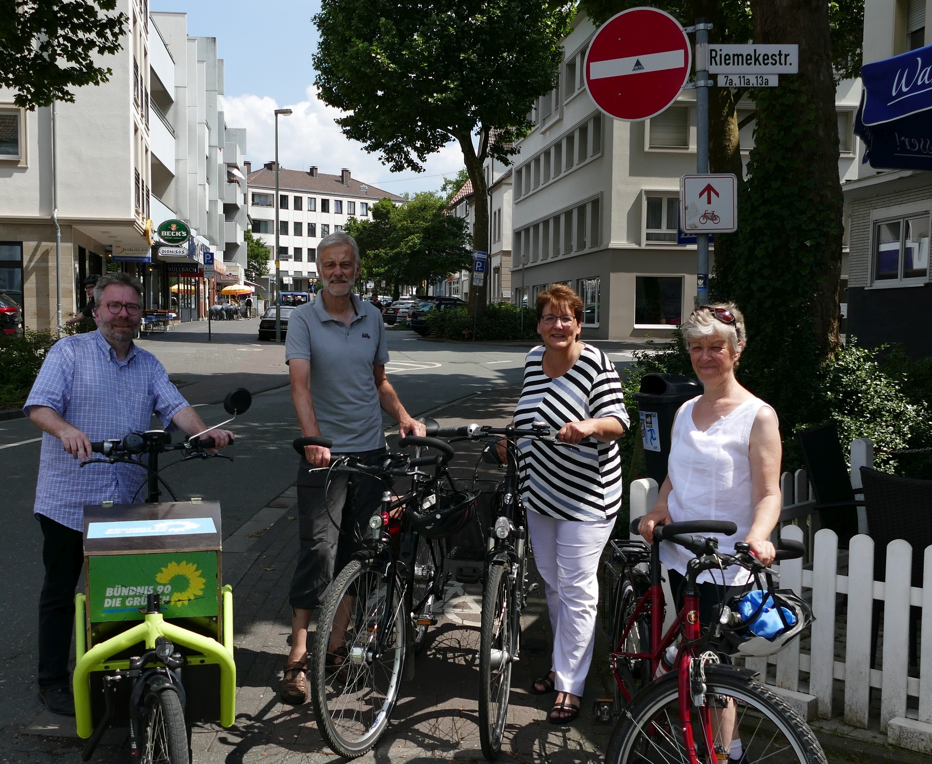 Startpunkt ist am Dienstag, 12. Juni, um 18 Uhr der Riemekepark zwischen Spielplatz und Gemeinschaftsgarten. Nach einem kurzen Informationsauftakt geht es auf die Radtour. Auch die Beschilderung der Kreuzung Riemeke-, Florian-, Ferdinandstraße wird Thema. Hier mit Johannes Menze, Claus-Jürgen Wagner, Petra Tebbe und Doris Opfer.