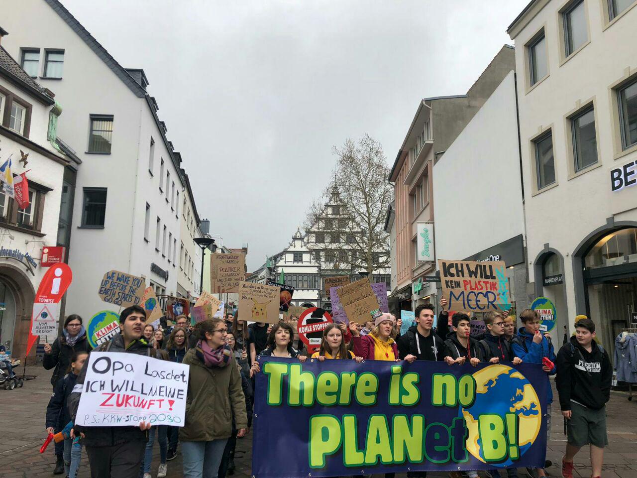 Das Foto zeigt den Protestzug der Paderborner Schülerinnen und Schüler, der von rund 200 Leuten auf dem Domplatz auf über 500 in der Westernstraße anwuchs.