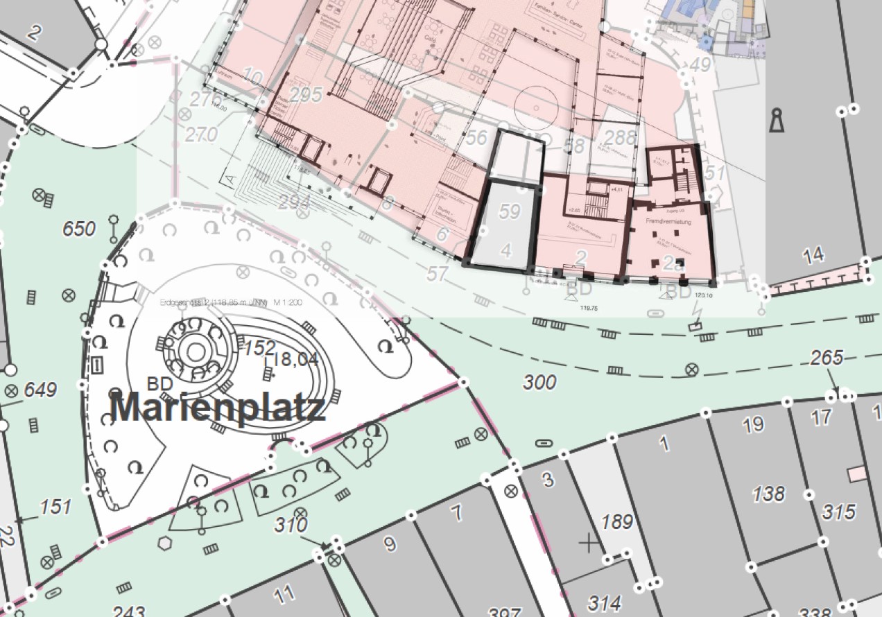 Nach Auskunft des Bürgermeisters wird die geplante Treppenanlage bis auf etwa vier Meter an die existierende Mauer am Marienplatz heranrücken. Der Bürgermeister habe jedoch klargestellt, dass sämtliche Angaben noch ungefähre Werte seien. Um einen Eindruck von der räumlichen Situation zu bekommen, haben die Grünen eine ungefähre Darstellung der neuen Situation erstellt (siehe Foto). Fraktionssprecher Dr. Klaus Schröder erläutert: „Auch da sind sicher noch deutliche Ungenauigkeiten drin, da wir uns nur an den vorhandenen Gebäuden orientieren konnten. Man sieht aber deutlich, wie die neue Anlage in die bestehende Fahrspur hineinragt. Die so notwendige Verlegung der Busspur führt dann zur Fällung der Linden.“