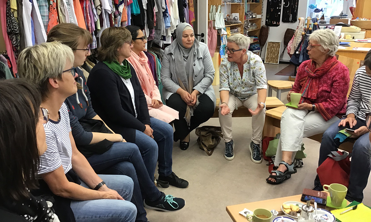 In die Reihe der Grünen Frauen „Frauen.Wirtschaften.Nachhaltig“ passt IN VIA gleich mit mehreren Projekten. So das Lädchen, das nicht nur gut sortierte Second-Hand-Kleindung zu äußerst günstigen Preisen anbietet, sondern auch Textil- und Kreativprodukte aus den eigenen Werkstätten verkauft. Upcycling – großgeschrieben – selbst aus kaputten Jeans werden neue Produkte, wie Taschen, Kissen und Teppiche hergestellt. „Verdienen kann man an den Sachen nicht,“ so Margret Schwede,“ aber darum geht es auch nicht“. Das Lädchen ist auch Begegnungsstätte und Wohlfühlort für Menschen, die in Einsamkeit leben, und ein Ort für niederschwellige Beratung.