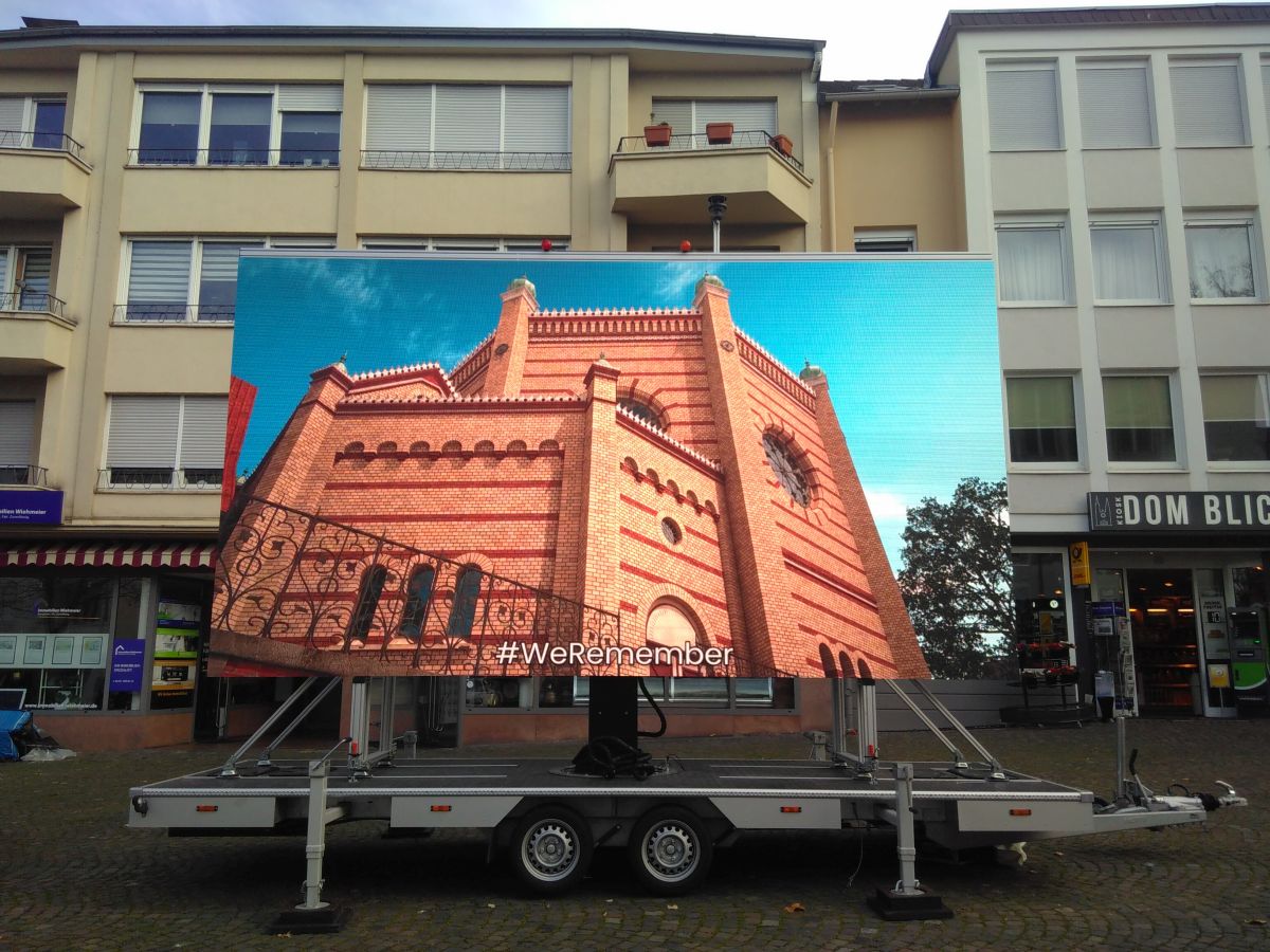 Beim Gedenken auf dem Platz An der alten Synagoge lasen Schüler*innen die Namen und Alter der ermordeten Mitbürger*innen vor: Hoch betagt in den Achtzigern bis zu einem sieben Monate alten Baby. Ihre Vornamen teils überraschend aktuell. Über Nacht bis weit in diesen Tag entstand die niedergebrannte Synagoge als eine 3D-Architektur-Video-Installation (Foto) eindrucksvoll neu und ließ viele Vorbeieilende, Nachtschwärmer wie Marktbesucher*innen, für Momente innehalten. Paderborn war einer von 13 ausgewählten Orten, an denen Rekonstruktionen der Synagogen visualisiert wurden. Es lässt den Verlust erahnen.