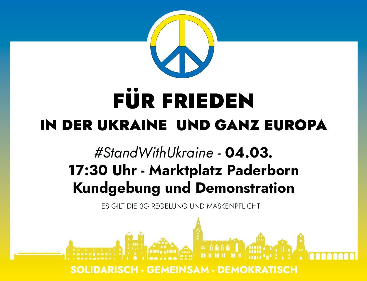 Das Paderborner Bündnis für Demokratie & Toleranz ruft alle Paderbornerinnen und Paderborner zur Teilnahme an der Friedenskundgebung auf dem Marktplatz am Freitag 4. März um 17:30 auf. Auf dem Marktplatz kommen zunächst osteuropäische Stimmen zu Wort. Unter dem Motto „Stoppt den Krieg – Solidarität mit der Ukraine“ schildert Dr.-Ing. Anatolii Andreiev die Lage in seinem Heimatland. Alexander Wittmer, Mitglied der deutsch-russischen Gesellschaft, beleuchtet die Verwerfungen im wechselseitigen Verhältnis. Der Vorsitzende des Partnerschaftskomitees Paderborn-Przemysl Dr. Janusz Bugaj berichtet aus der Partnerstadt, die zehn Kilometer entfernt von der ukrainischen Grenze liegt. Dr. Peter Witte von pax christi resümiert die Herausforderungen für die Friedensbewegung durch den völkerrechtswidrigen Angriffskrieg. Johannes Lackmann thematisiert die Energieabhängigkeit und ihre Folgen. Zum Schluss der Kundgebung akzentuiert Anne Birkelbach die demokratischen Werte. Musikalisch umrahmen Ulli Koppenburg, Klaus Schüssler und Manfred Jäger die Kundgebung