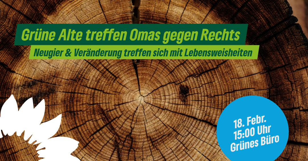 Normalerweise treffen sich die Grünen Alten am zweiten Mittwoch um 15.00 Uhr im Grünen Büro. Für Februar haben die „Omas gegen Rechts“ versprochen, von ihren Aktivitäten zu berichten. Wie gesagt, eine Woche später am 18. Februar. Alle, die über 60 Lebensjahre alt sind, sind herzlich willkommen.